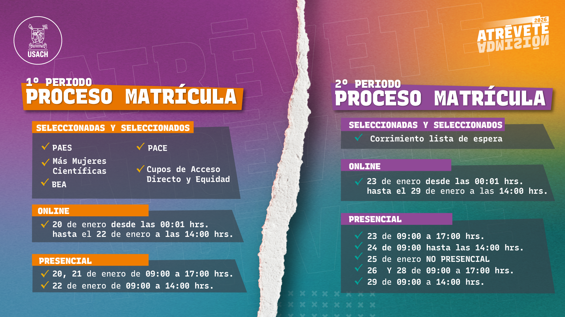 *Para el segundo periodo de matrícula, que corresponde a corrimientos de lista de espera, la Universidad de Santiago de Chile informará, a través de su sitio web, los corrimientos de lista que se puedan generar.